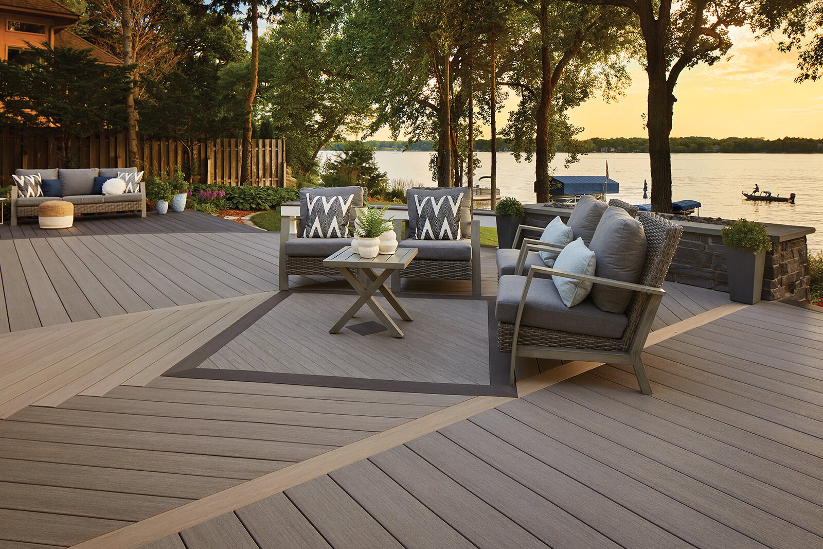 甲板距离湖面漫步,非常适合户外庆典。中午的注意事项说,防滑是选择TIMBERTECH AZEK板的一个关键因素,为该项目安全地容纳“湿触发器上下楼梯的人们”。